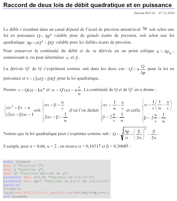 function f_Quadratic input Real x "Abscissa"; input Real u "Junction abscissa"; input Real n "Exponent of the function, in range ]1/2,1["; output Real q "Value of the function q at x"; output Real q1 "Value of the derivative function of q at x"; end f_Quadratic;