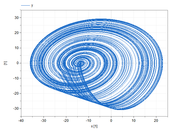 The results meant for plotting are labeled. Normally plot one result variable versus the other, in this example y vs. x and / or z vs. x. Of course the initial transient depends on the initial conditions.