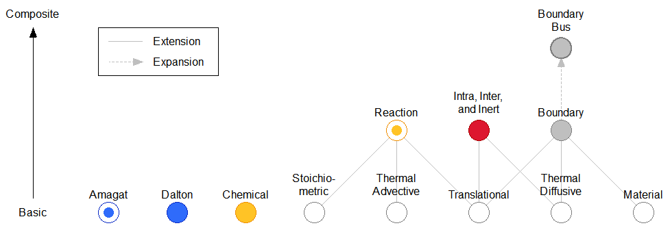 Figure 1 shows the hierarchy of the declarative connectors. The top row contains a bus connector (BoundaryBus), which expands to group the Boundary connectors of multiple species. The connectors in the middle row are flat; they build on the connectors of the bottom row by extension. Each icon on the bottom row represents one effort/flow pair, which may or may not be implemented as a separate connector. The Chemical connector also has stream variables to represent the advection of translational momentum and thermal energy.