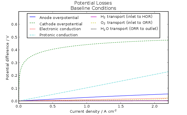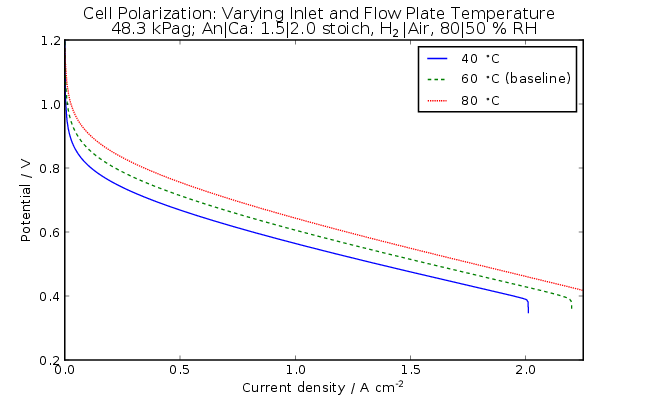 The figures below show the results from several cell-level examples of FCSys. The models were simulated using Dymola 2014. The plots were generated using ModelicaRes. For more information, please follow the links to the associated models. For discussion and more results, please see [Davies, 2014].