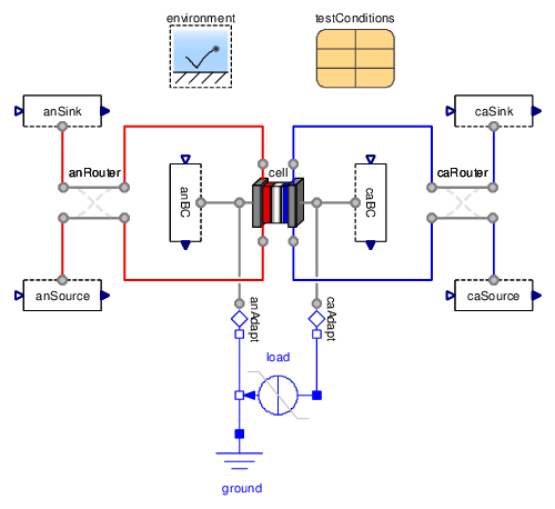 The fuel cell model can be exercised using the test stand shown in Figure 3 or connected to the Modelica fluid library using available adapters. Please see the sample cell results for examples and the getting started page for information about using the library.