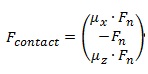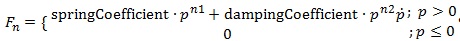 In the case of a collision of the two connected surface (the contact condition holds for at least one contact point) a three-dimensional contact force is applied. It consists of both the normal force and the tangential friction. The respective directions can be obtained by means of the local coordinate systems in the contact points. As compared to more complex models, the continuous surface layer is replaced by a nonlinear spring/damper element. Consequently, the normal force Fn is determined by means of the penetration p and the penetration velocity. A continuous contact force model with hysteresis damping according to [1] is implemented. Nevertheless, choosing n1=1 and n=0 one can get the linear Kelvin-Voigt model, where the coefficients are the spring and damping constant. Choosing n1=n2 one will get the formulation according to [2].