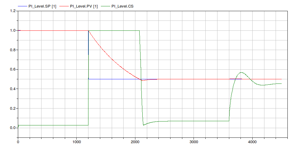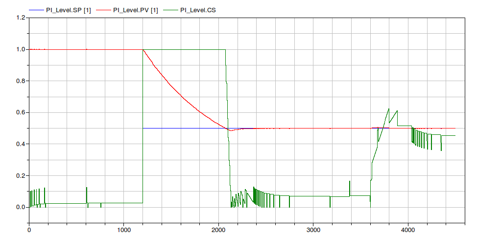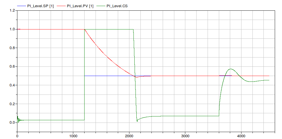 In the first phase the controller is asked to maintain the level at the initial value (SP = 1 m), at t = 1200 s the level set point
