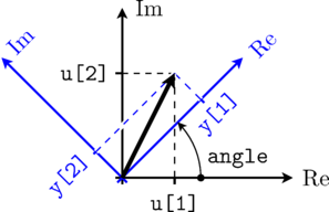 Rotates a space phasor (voltage or current) input u by the angle in negative mathematical direction. This block represents the transformation of one space phasor u from one rotating reference (coordinate) frame into another where the space phasor is y. The output reference frame leads the input reference frame by angle angle.