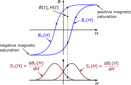 The Tellinen hysteresis model is a simple model to describe the magnetic hysteresis behavior of ferromagnetic materials. It only uses the rising (hystR) and falling (hystF) branch of the major hysteresis loop and their derivatives der(hystR) and der(hystF). See Fig. 1 and the following equations for a short description of the Tellinen hysteresis model.