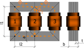 Simple model of a three-phase transformer with primary and a secondary windings and a magnetic E-I shaped core. The core is modeled with GenericHystTellinenEverett flux tube elements. Thus, this model considers static and dynamic hysteresis as well as initial flux.