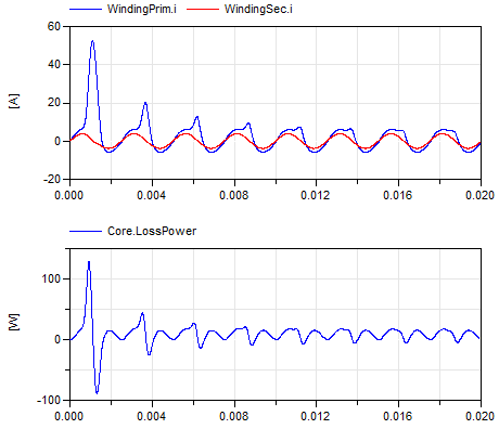 Then plot the flux density of the Core Core.B over the magnetic field strength Core.H and additionally the time course of the primary and secondary current and e.g. the power consumption of the iron core Core.LossPower (see the following figures).