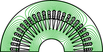 The main components of an electric machine model based on the FundamentalWave library are polyphase and single-phase windings, air gap as well as symmetric or salient cage models. The electric machine models provided in this library are based on symmetrical windings in the stator and equivalent two-phase or three-phase windings in squirrel cage rotors. Slip ring induction machines may have different phase numbers in the stator and rotor.