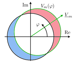 The potential and flow quantities of this library are the complex magnetic potential difference and the complex magnetic flux as defined in the basic magnetic port. Due to the sinusoidal distribution of magnetic potential and flux, such a complex phasor representation can be used. This way, the FundamentalWave library can be seen as a spatial extension of the FluxTubes library.