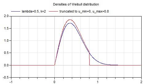 This function computes the probability density function according to a truncated Weibull distribution with minimum value u_min, maximum value u_max, scale parameter of original distribution lambda and shape parameter of original distribution k. Plot of the function: