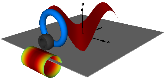 This example demonstrates the use of the Surface visualizer that visualizes a moving, parameterized surface. The "sine-wave" surface is a direct application of the surface model. Furthermore, the "torus" surface is an instance of Torus, the "wheel" surface is an instance of VoluminousWheel, and the "pipeWithScalarField surface is an instance of PipeWithScalarField. All latter visual shapes are constructed with the surface model. The following image shows a screen-shot of this example model: