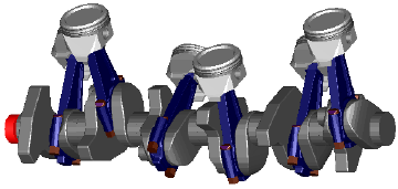 This is a similar model as the example "EngineV6". However, the cylinders have been built up with component Modelica.Mechanics.MultiBody.Joints.Assemblies.JointRRR that solves the non-linear system of equations in an aggregation of 3 revolution joints analytically and only one body is used that holds the total mass of the crank shaft: