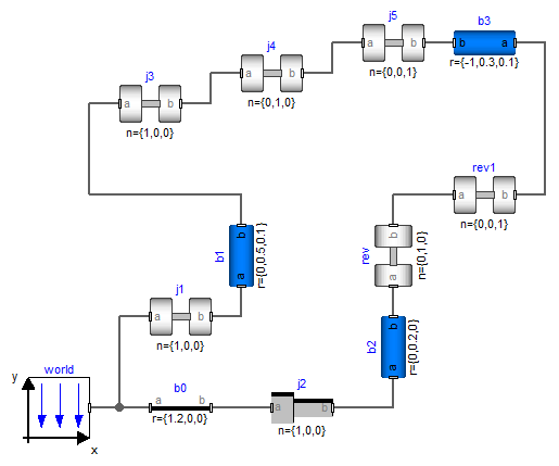 In principal, no special action is needed, if loop structures occur (contrary to the ModelicaAdditions.MultiBody library). An example is presented in the figure below. It is available as MultiBody.Examples.Loops.Fourbar1