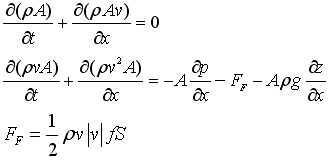 The mass and momentum balance equations in a component are derived from the partial differential equations along the flow direction of a pipe: