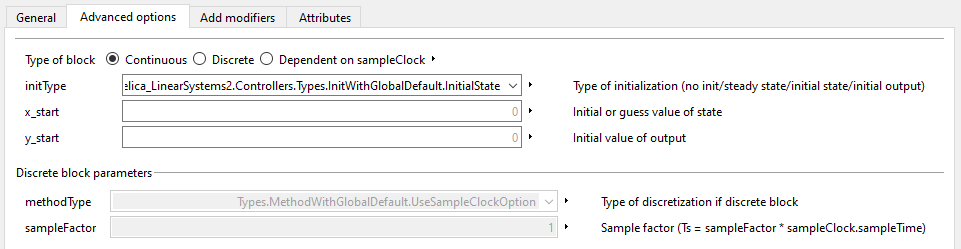 Block SampleClock defines options for all components of the Controllers library that are on the same or on a lower level as the sampleClock component. In every block, the default defined in SampleClock can be changed. The following options are available:
