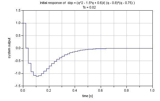 DiscreteZerosAndPoles q = Modelica_LinearSystems2.DiscreteZerosAndPoles.q(); Modelica_LinearSystems2.DiscreteZerosAndPoles dzp=(q^2 - 1.5*q + 0.6)/( (q - 0.8)*(q - 0.75) ) Real y0=1; dzp.Ts = 0.02; Modelica_LinearSystems2.DiscreteZerosAndPoles.Plot.initialResponseZP(dzp, y0=y0, tSpan=1) // gives:
