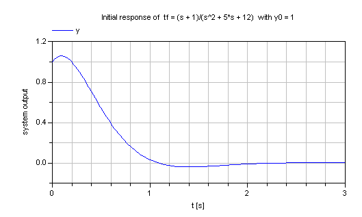 TransferFunction s = Modelica_LinearSystems2.TransferFunction.s(); Modelica_LinearSystems2.TransferFunction tf = (s + 1)/(s^2 + 5*s + 12); Real y0=1; algorithm Modelica_LinearSystems2.TransferFunction.Plot.initialResponse(tf,y0=y0, dt=0.02, tSpan=3) // gives: