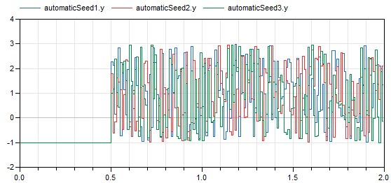 The blocks automaticSeed1, automaticSeed2, automaticSeed3 use the default option to automatically initialize the pseudo random number generators of the respective block. As a result, different noise is generated, see next diagram: