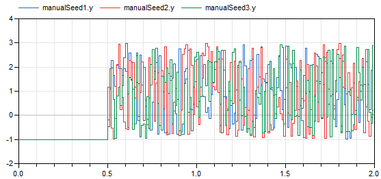 The blocks manualSeed1, manualSeed2, manualSeed3 use manual selection of the local seed (useAutomaticLocalSeed = false). They use a fixedLocalSeed of 1, 2, and 3 respectively. Again, different noise is generated, see next diagram:
