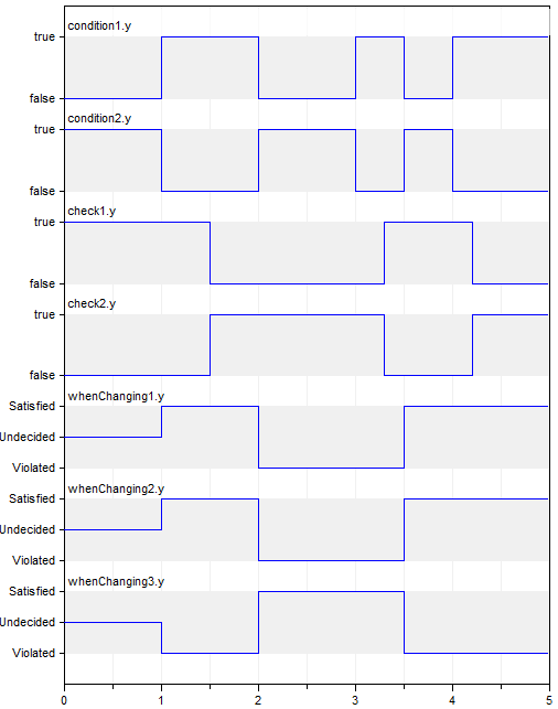 At the time instants where condition has a changing edge, property is set to "BooleanToProperty(check)" (so either Satisfied or Violated) and keeps this value until the next changing edge. At initialization, property = Undecided, independently of the value of condition.