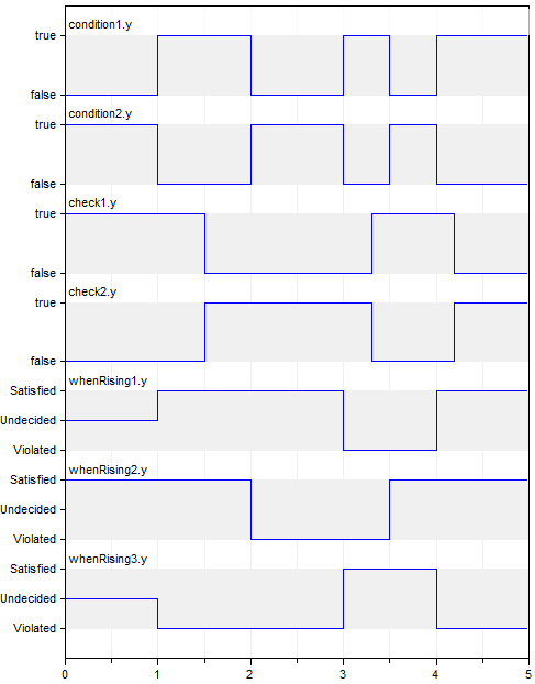 At the time instants where condition has a rising edge, property is set to "BooleanToProperty(check)" (so either Satisfied or Violated) and keeps this value until the next rising edge. Before the first rising edge, property = Undecided. If condition = true during initialization, property = toProperty(check) at initialization.