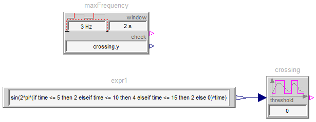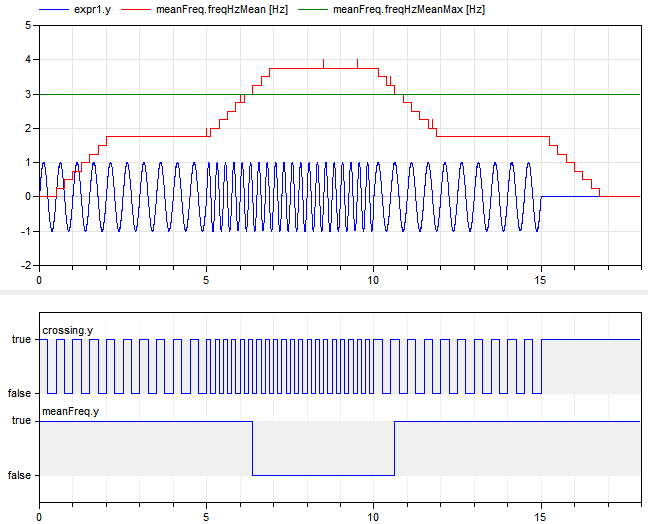 where nCrossing is the number of crossing edges of check in the last time window of length window. The mean frequency over the sliding time window is also provided as additional output signal freqHzMean. If the mean frequency is not larger as freqHzMeanMax, output y is set to true, otherwise to y = false.