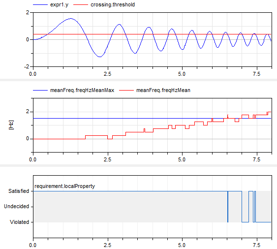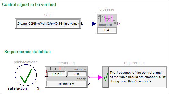 The mean frequency of the control signal of the valve must not exceed 1.5 Hz during any 2 seconds time window. The mean frequency freqHzMean in this window is defined asT : Length of sliding window (= 2 seconds) nCrossing: Number of threshold crossing edges of check in the last T seconds if nCrossing > 1 then freqHzMean = 1/(T/( (nCrossing-1)/2 )); else freqHzMean = 0 end if;