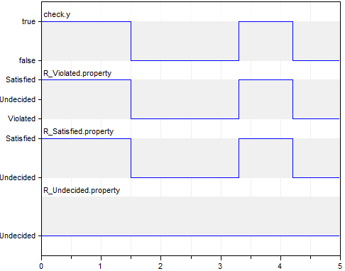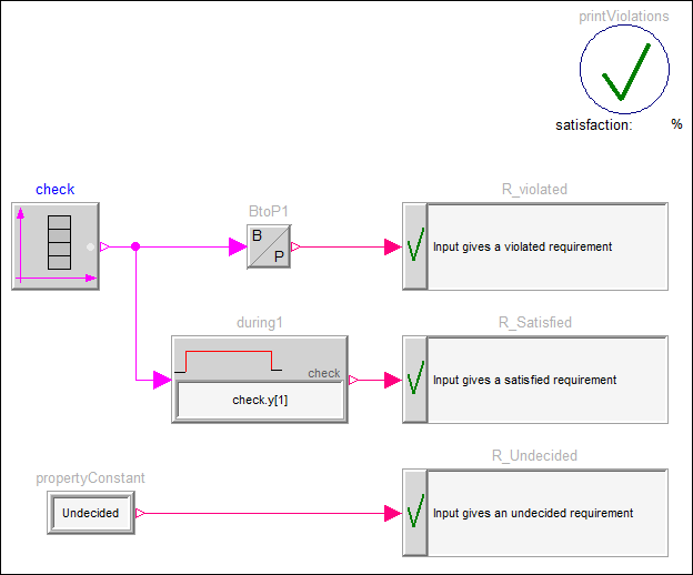 This block is used to verify a requirement. The input signal "property" can have the three values Violated, Undecided, or Satisfied (= elements of enumeration Property). A requirement is violated, if property = Violated, it is untested, if property = Undecided, and it is satisfied, if property = Satisfied. If a required property is naturally defined as Boolean, use block BooleanRequirement instead.