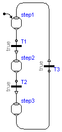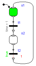 A fireable transition will fire immediately. In the figure to the right, t1 fires when s1 is active and time is greater than one, i.e., s1 becomes inactive and s2 becomes active. The firing of a transition can optionally also be delayed for a certain period of time defined by parameter "waitTime". See, e.g., t2 in the figure to right, that is delayed for one second before it may fire, given that the condition remains true and the preceding Step remains active during the entire delay time.