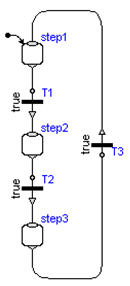 In order to avoid a situation as in the Figure to the right, it is required that a StateGraph2 model has at least one delayed Transition per loop. This means that one of T1, T2, or T3, must be a delayed Transition, otherwise a translation error occurs. Since event iteration stops at a delayed Transition, infinite event looping cannot occur. This also means that at one time instant every Transition can fire at most once and therefore the number of model evaluations at an event instant is bounded by the number of Transition components.