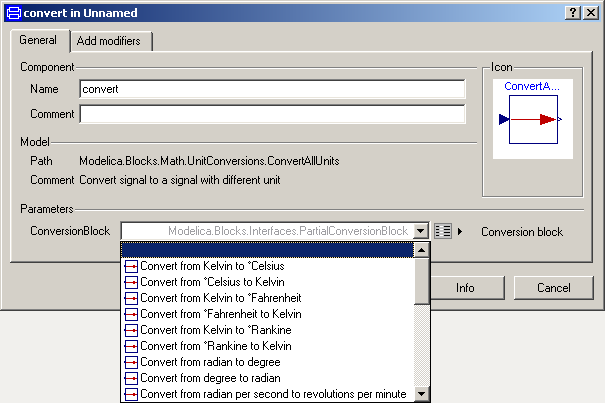 This block implements the Modelica.SIunits.Conversions functions as a fixed causality block to simplify their use. The block contains a replaceable block class ConversionBlock that can be changed to be any of the blocks defined in Modelica.Blocks.Math.UnitConversions, and more generally, any blocks that extend from Modelica.Blocks.Interfaces.PartialConversionBlock.
