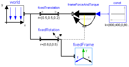 The 6 signals of the load connector are interpreted as the x-, y- and z-coordinates of a force and as the x-, y-, and z-coordinates of a torque acting at the frame connector to which this component is attached. If connector frame_resolve is not connected, the force and torque coordinates are with respect to frame_b. If connector frame_resolve is connected, the force and torque coordinates are with respect to frame_resolve. In this case the force and torque in connector frame_resolve are set to zero, i.e., this connector is solely used to provide the information of the coordinate system, in which the force coordinates are defined. The input signals are mapped to the force and torque in the following way: