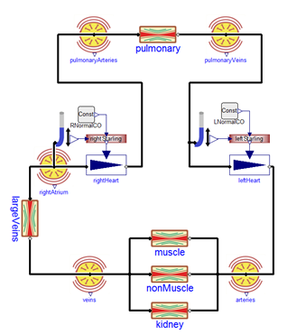 The main usage of the hydraulic domain in human physiology is modeling of the cardio-vascular system. And because there are no extreme thermodynamic conditions, the system can be really simple —it is only necessary to model conditions for incompressible water, at normal liquid-water temperatures and with relative pressure 5-20kPa. This boring thermodynamic state leads to the very simple blocks of hydraulic resistance, hydrostatic pressure, volumetric flow, inertia and finally the block of blood accumulation in elastic vessels. |