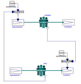 Population models are based on increasing and decreasing of average number of population members. The number of population member is a nonflow variable in connectors and flow variable is the change of population members. The growth or differentiation of cells can be modeled as stream from one population component to another, where each population component could be defined by selected age, type, function or wathever.. Even the domain is integer, all is modeled by real numbers. |
