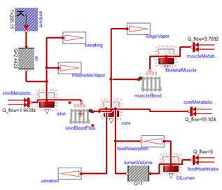 For the human body to function optimally, it is critical to hold the core temperature at 35–39°C. A fever of 41°C for more than a short period of time causes brain damage. If the core temperature falls below 10°C, the heart stops. As in the hydraulic domain, the thermal domain is simplified to these conditions. In the Thermal package extends the package Modelica.Thermal.HeatTransfer from Modelica Standard Library 3.2 (MSL), where the connector is composed of temperature and heat flow. The main blocks in Thermal are: Conductor, IdealRadiator and HeatAccumulation. The heat conductor conducts the heat from the source, such us muscles or metabolically active tissue, to its surrounding. IdealRadiator delivers heat to tissues by blood circulation. HeatAccumulation plays a role in accumulating thermal energy in each tissue mass driven by its heat capacity. We recommend to use this block instead of Modelica.Thermal.HeatTransfer.HeatCapacitor to have possibility of variable mass amount or to have a support for calculation of steady state. |