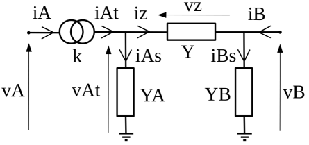 The model can be specialized to describe a transmission line with fixed or variable impedances, a transmission line with embedded circuit breakers, transformers with fixed or variable transformer ratio, transformers with tap changer/phase shifter, etc.