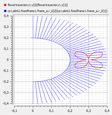 The Workspace2d generates references values between the ranges of the joints feasible motion. This values are then introduced into Angular position sources (from MSL ) and then connected to the RR component.