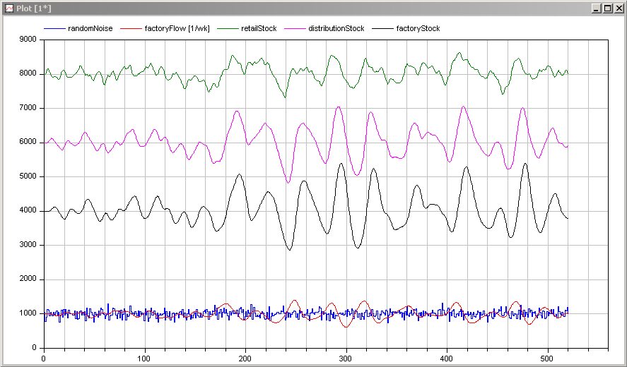 Simulate the model across 10 years (520 weeks), and plot on a single graph the incoming orders, the production flow in the factory, and the levels of goods in retail, distribution, and the factory as functions of time: