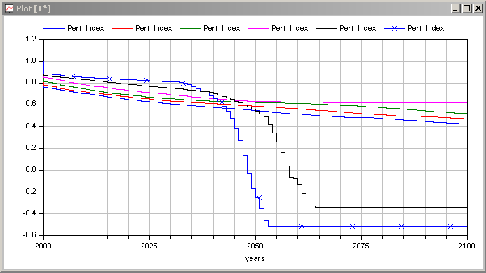 Plot the performance index across the calendar years between 2000 and 2100 for all six scenarios on a single graph: