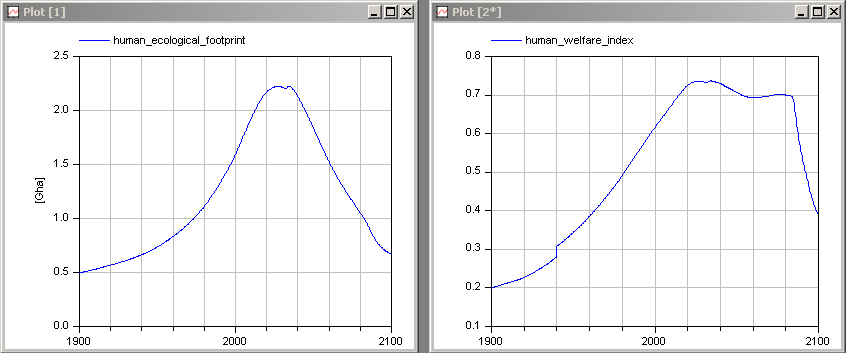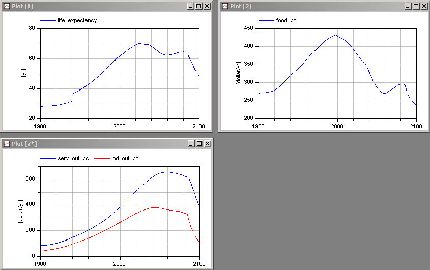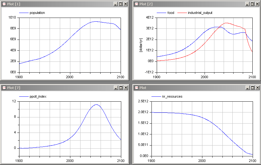 Simulate the model from 1900 until 2100, and display the same variables as in the book Limits to Growth: The 30-Year Update at page 211: