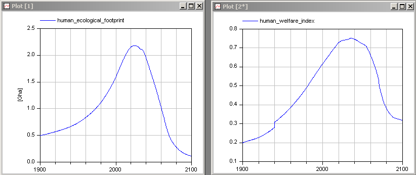 Due to the amplified quantization errors, the collapse happens more than 20 years earlier than shown in the book. If we were to simulate beyond the year 2100, the results obtained using the Modelica implementation could be considered similar to those obtained using STELLA. The trajectories simply get shifted in time. However, since we stop the simulation in 2100, our results look qualitatively different.