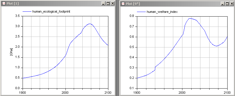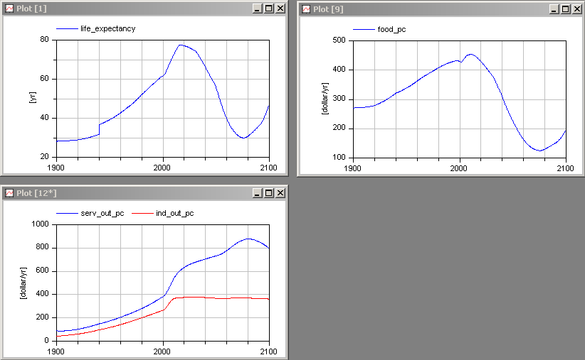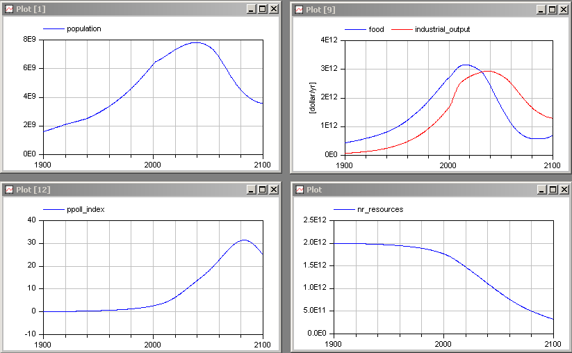 Simulate the model from 1900 until 2100, and display the same variables as in the book Limits to Growth: The 30-Year Update at page 243:
