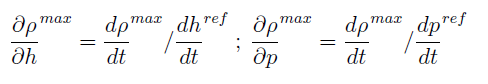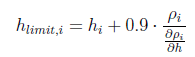 This strategy acts on the partial derivative of density with respect to pressure and enthalpy. The peak in the density derivative occurring after the transition from liquid to two-phase is truncated. The maximum time derivative of the density is a model parameter and the maximum partial derivatives are calculated using the following equation: