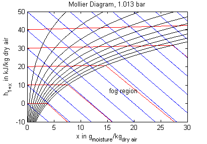 At the triple point temperature of water of 0.01 °C or 273.16 K and a relative humidity greater than 1 fog may be present as liquid and as ice resulting in a specific enthalpy somewhere between those of the two isotherms for solid and liquid fog, respectively. For numerical reasons a coexisting mixture of 50% solid and 50% liquid fog is assumed in the fog region at the triple point in this model.