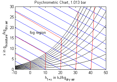 Legend: blue - constant specific enthalpy, red - constant temperature, black - constant relative humidity