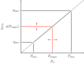 The electrical and overall efficiencies are calculated based on a linear interpolation approach between minimum and maximum power output, as can be seen in the following picture