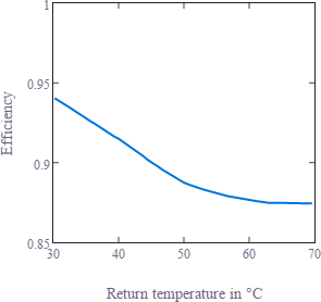 From the part load of the boiler and the return flow temperature, the boiler efficiency and fuel heat input is calculated with characteristical lines.