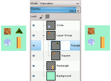We added a white layer in the layer group with saturation mode: only square and triangle are grayed out.
