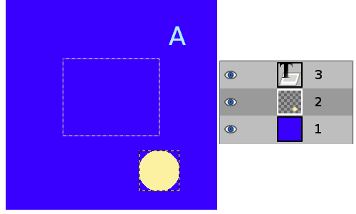 An image with a selection, layer #1 (background) is active, layer #2 is cropped to content, layer #3 is a text layer.
