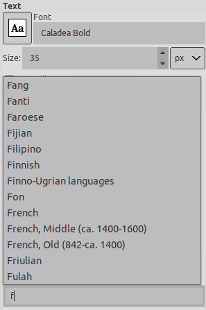 The text language may have an effect on the way the text is rendered. The default language is “Caddo”, the language of several Southeastern Native American tribes. If you enter a letter in this field, you get the list of all available languages whose names begin by this letter: